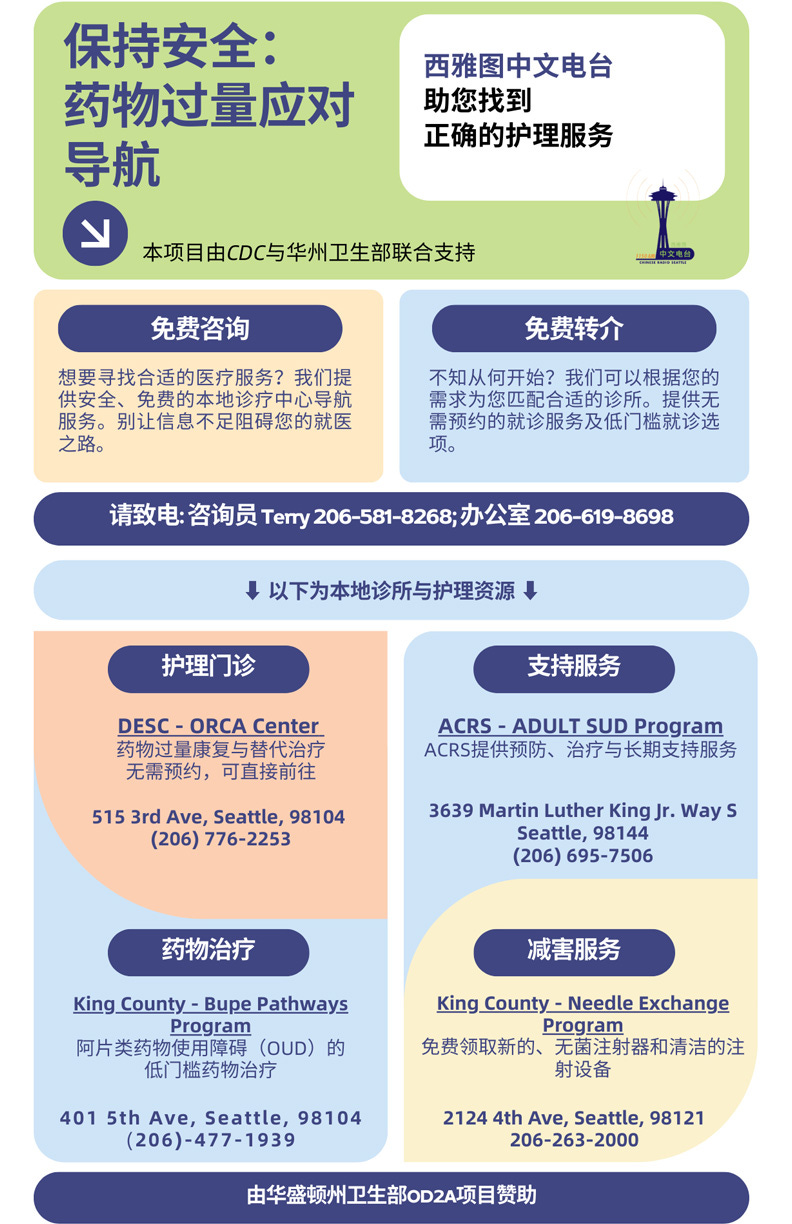 当下,西雅图中文电台正与华盛顿州卫生厅合作,为华人社区带来与药物成瘾防治有关的公益健康信息。点击这里了解详情。